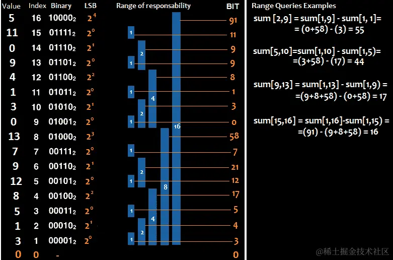 a=1:如果a=1=0b00001,则b=0b00001+0b00001=1+1=2=0b00010。我们说 2 负责a(也就是 1)。因此,在位中,在索引 1 处,我们存储值 3,在索引 2 处,我们存储值的和,3+1=4。a=2:如果a=2=0b00010,则b=0b00010+0b00010=2+2=4=0b00100。我们说 4 负责a(即 2)。因此,在索引 4 处,我们以位的形式存储值的和,8+4=12。a=3:如果a=3=0b00011,则b=0b00011+0b00001=3+1=4=0b00100。我们说 4 负责a(也就是 3)。因此,在位中,在索引 4 处,我们存储值的和,12+5=17。a=4。如果a=4=0b00100,则b=0b00100+0b00100=4+4=8=0b01000。我们说 8 负责a(也就是 4)。因此,在位中,在索引 8 处,我们存储值的和,13+17=30。