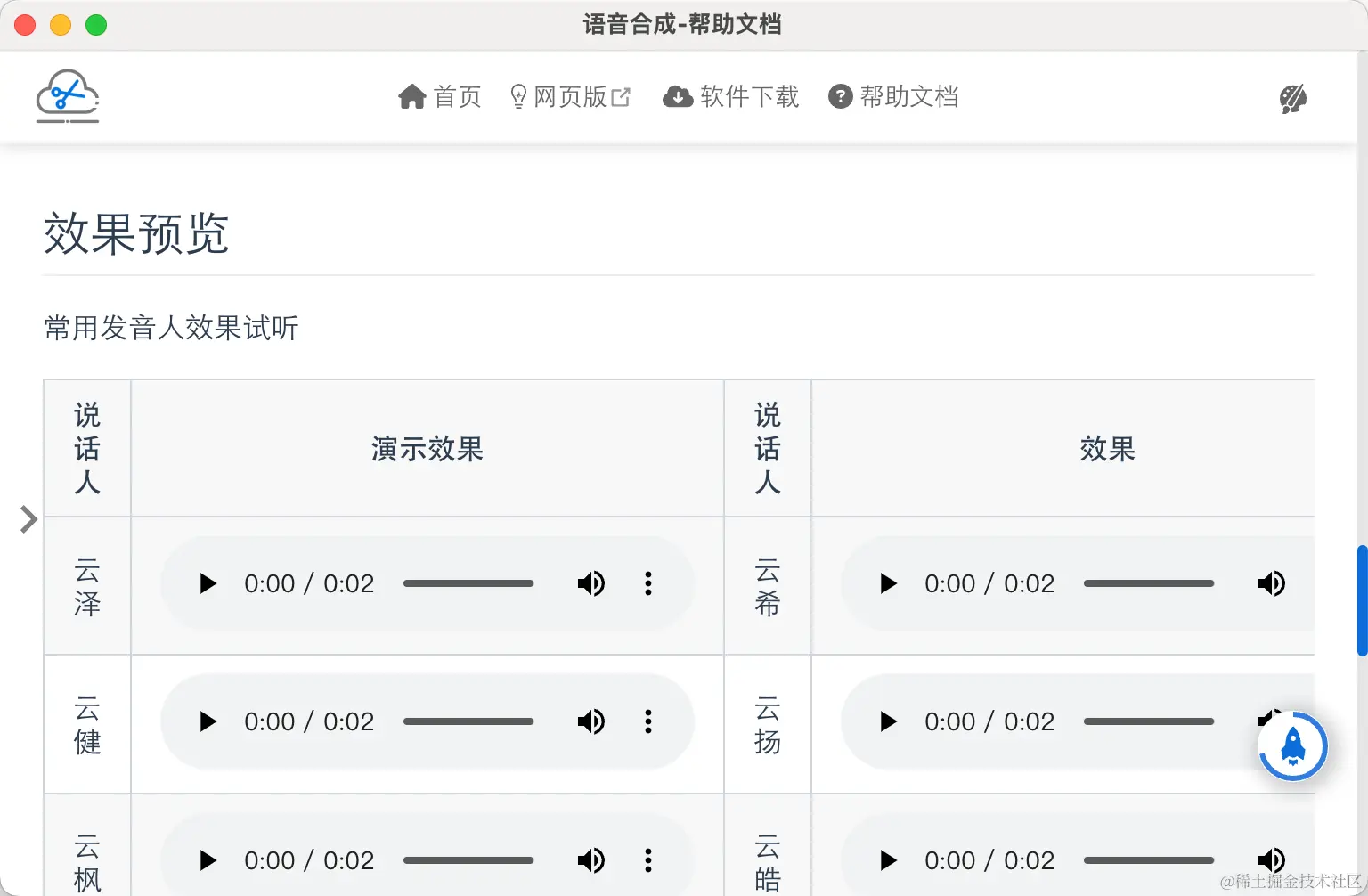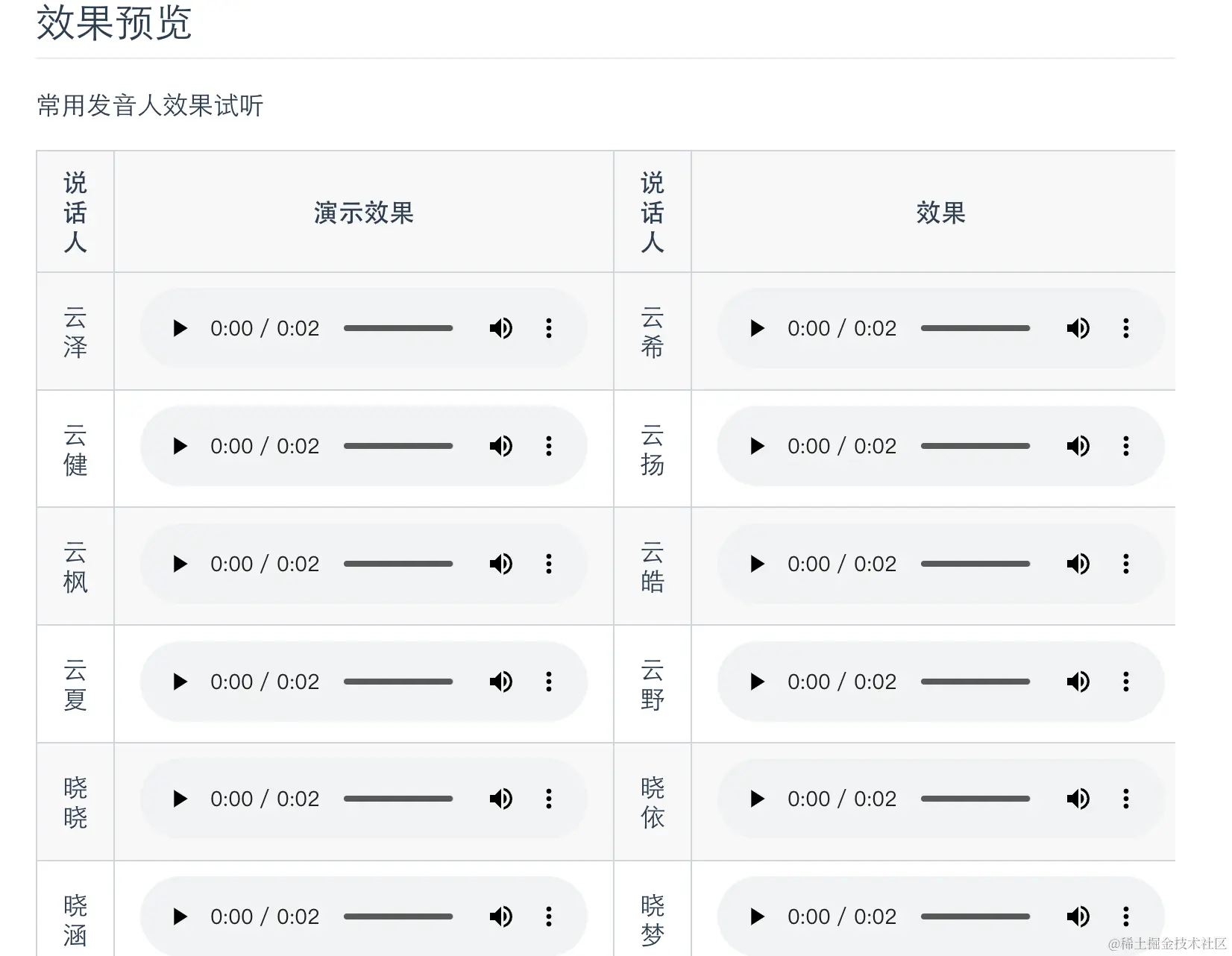 语音合成部分我们把所有发音人的试听都加上去了,大家可以先试听一下效果,然后再选择自己喜欢的发音人进行合成