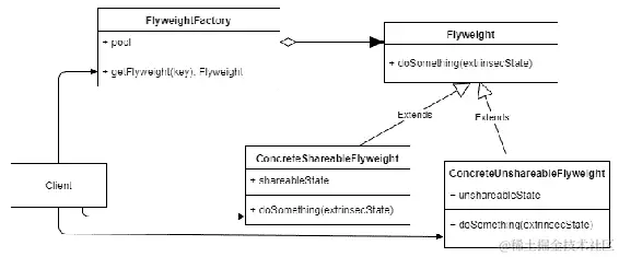 下图显示了享元对象是从池中返回的,为了运行,它需要将外部状态(extrinsic)作为参数传递。有些享元可以与其他享元共享状态,但这不是强制执行的规则: