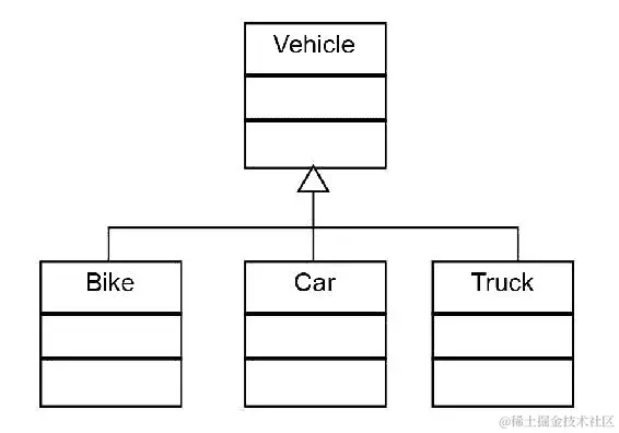 让我们举一个真实的例子。如果我们把Vehicle看作父类,我们就知道Vehicle可以有某些属性和行为。例如,它有一个引擎、门等等,而且它可以移动。现在,所有满足这些标准的实体,例如,Car、Truck、Bike等等,都可以从Vehicle继承并添加到给定的属性和行为之上。换句话说,我们可以说Car是Vehicle的子类。
