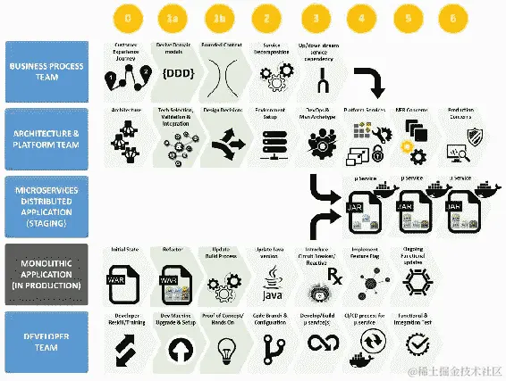 一旦确定了转型机会,我们可以将现有的单片应用程序转移到分布式应用程序模型。我们看到需要在人员、流程和技术层面采取各种步骤。