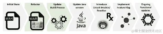 引入断路器/响应式模式:代码重构的下一步是升级代码以实现弹性模式。您可以通过实现 Java 库(如 Hystrix)引入断路器等模式。您还可以通过实现异步消息传递、引入响应式框架(如 Spring Boot、Vert.x、Dropwizard 等)以及改进并发性(如 Akka、RxJava 等)来改进模块间的代码,并将所有更改应用到生产代码并与分支代码集成。