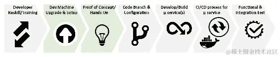 - 开发人员再培训/培训:首要任务是教导开发人员新的应用架构技术和设计模式。这意味着课堂培训、在线技术培训、供应商产品会议/培训等等。提升团队技能的另一种方法是雇佣具有相关技能的人,并让他们在现有开发团队的支持下带头进行整体开发。