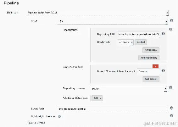 在流水线配置中,指定 GitHub 仓库和 Git 仓库中Jenkinsfile的路径:
