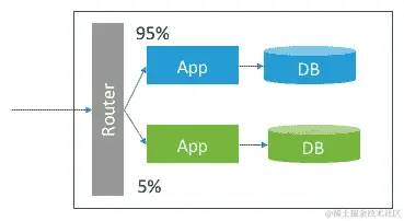 金丝雀部署也是蓝绿部署的一种变体。金丝雀部署解决了同时运行两个生产实例时浪费资源的问题,尽管时间很短。在金丝雀部署中,绿色环境是蓝色环境的缩减版本,并且依赖路由器的能力,始终将一小部分请求路由到新的绿色环境,而大部分请求则路由到蓝色环境。以下图表描述了这一点: