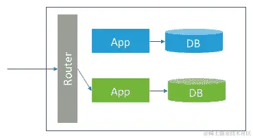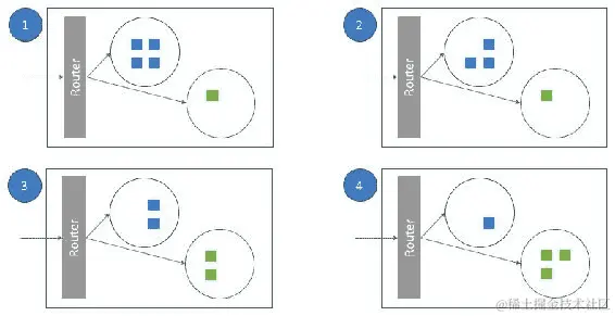 在部署的下一个阶段,路由器上会打开一个象征性的开关,现在开始将所有请求路由到绿色实例,而不是旧的蓝色实例。旧的蓝色实例会保留一段时间进行观察,如果检测到任何关键问题,我们可以根据需要快速回滚部署到旧的应用实例: