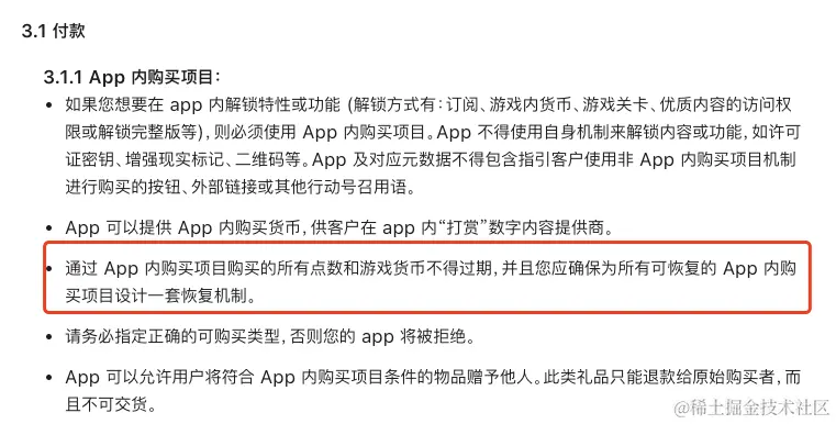 我们当时也只是着重看了这里,所以没有加登录,结果惨遭拒绝。被拒原因是:因为我们APP有消耗类IAP,审核员没有看到可以恢复的地方。后面我们仔细看了下苹果的关于付款的说明,才知道加上登录的体系是有必要的。要么是自己做账密登录,要么是做第三方的登录。如果是第三方登录的话,一定要有苹果登录。