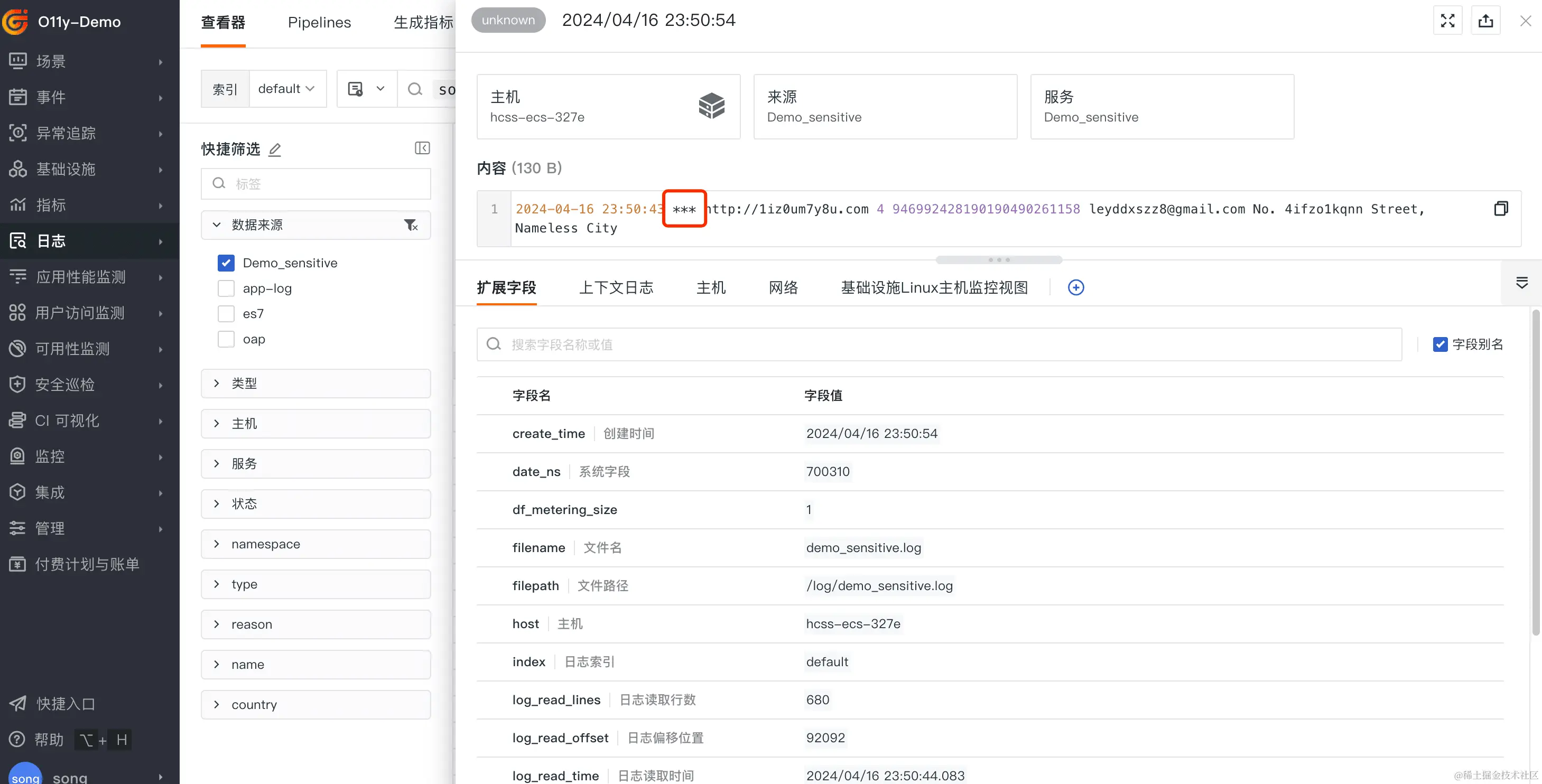 数据采集上报到观测云工作空间以后,部分数据中存在的一些敏感信息字段,比如 IP 地址、用户信息等,针对这部分信息可以通过配置敏感字段来做脱敏处理。