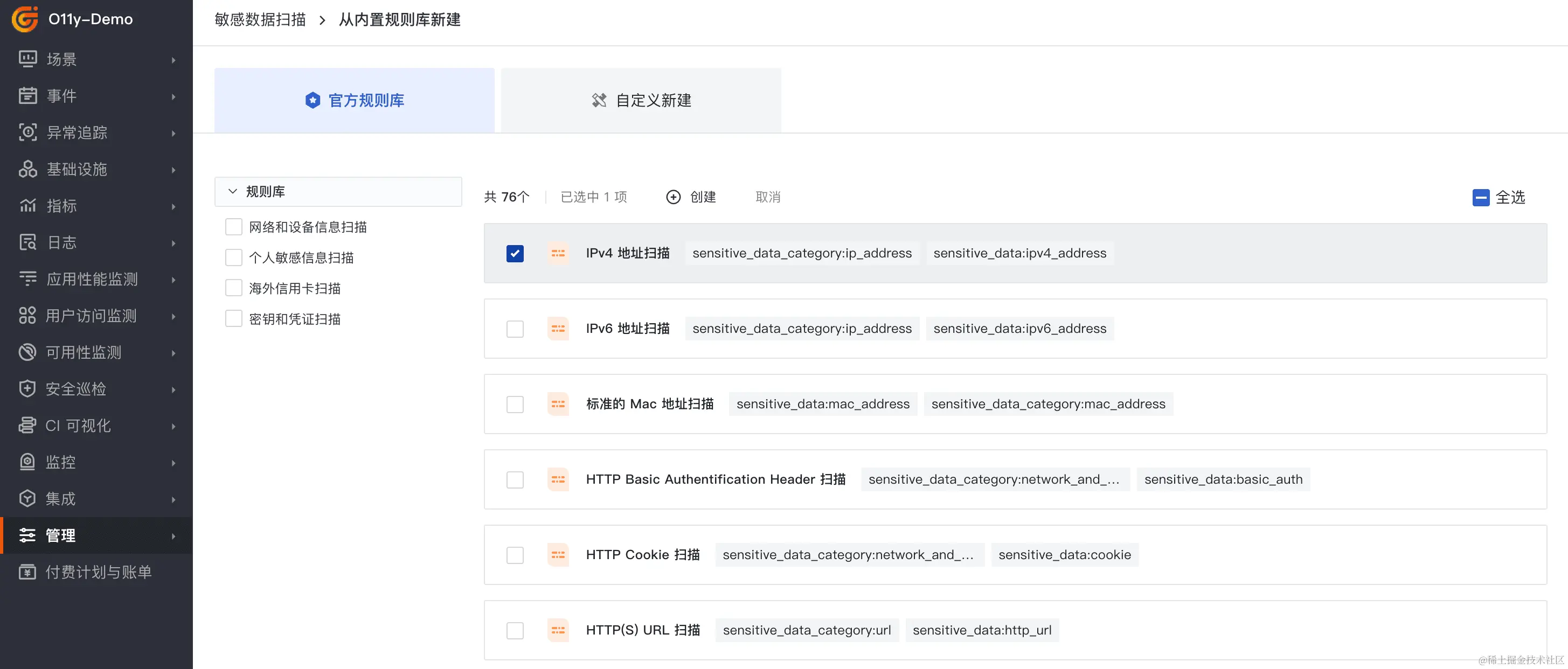 2、选择“官方规则库”,从规则库中选择相应规则,比如 IPv4 地址扫描,然后点击“创建”。