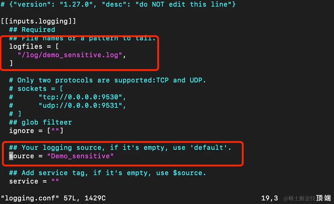 logging.conf文件中的日志文件路径,并自定义一个容易区分的 source 名称。示例如下: