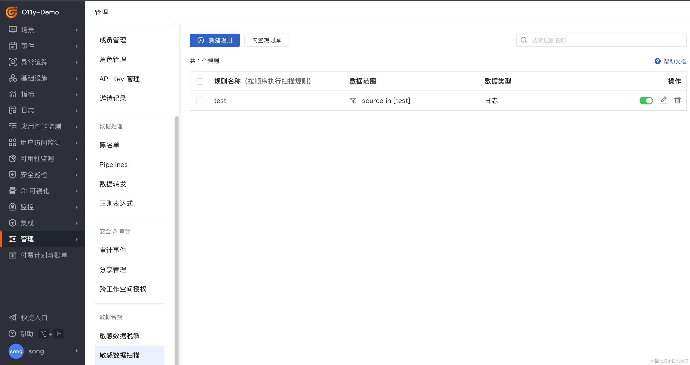在使用观测云产品的过程中,会不可避免地产生如网络设备地址、Token、API 密钥、个人隐私等诸多敏感数据。为避免信息泄露,造成安全风险,观测云提供敏感数据扫描的功能,通过为数据创建脱敏规则的方式,实现自定义信息屏蔽。