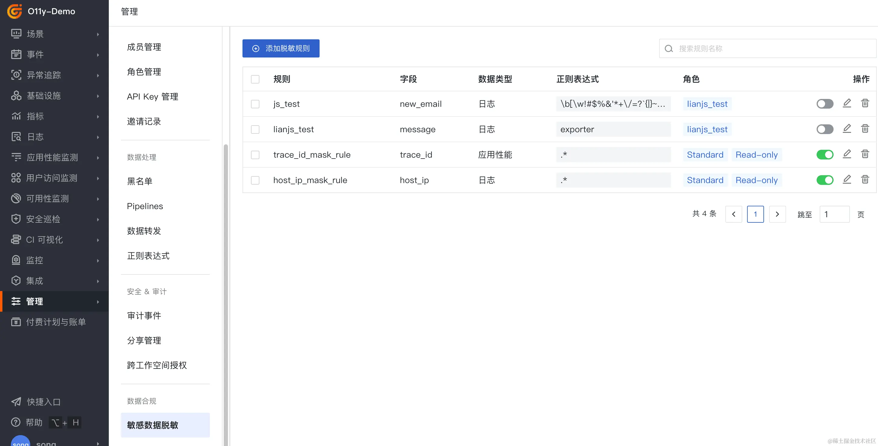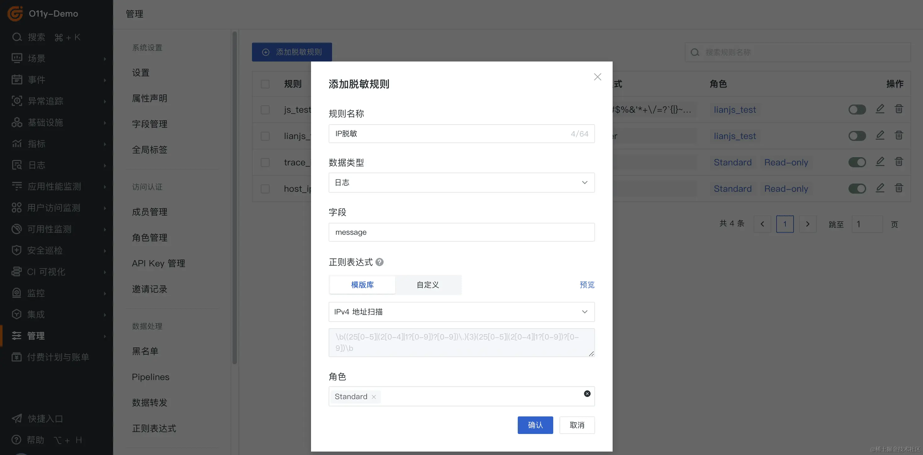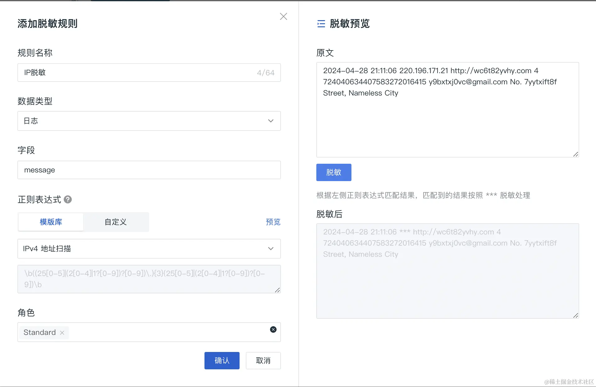 注意:基于角色级别配置敏感数据屏蔽规则,当选定的角色查看日志数据时 IP 地址会被 *** 替代;支持多选。