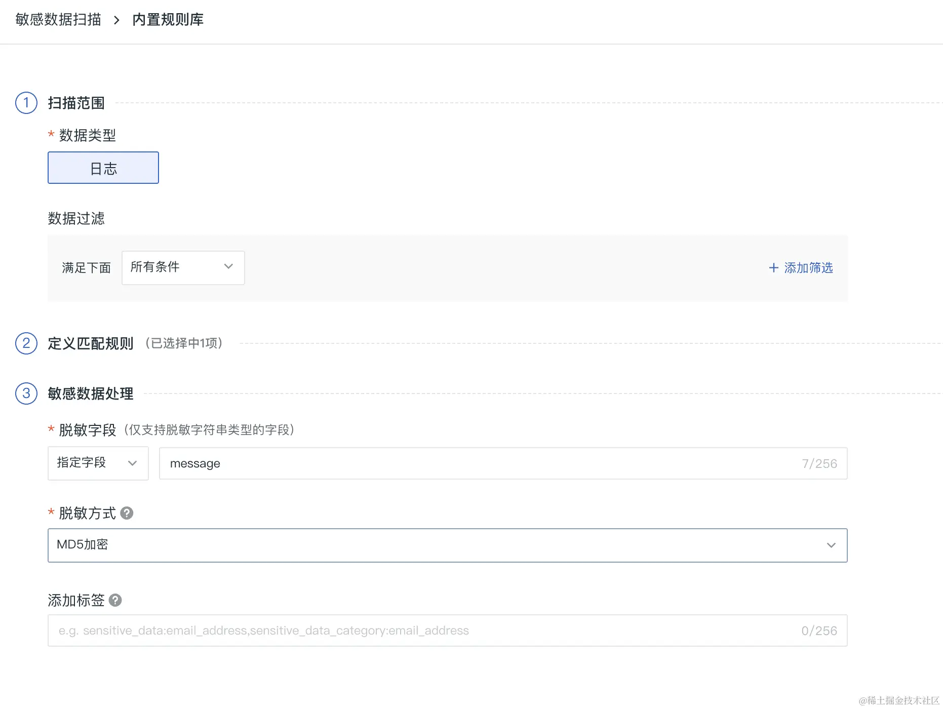 2、点击“添加敏感规则”,并配置相应的“规则名称”,“数据类型”选择日志,“字段”选择 message ,“正则表达式”从模版库中选择相应的脱敏规则,或者自定义正则表达式,“角色”选择相应的账号角色,比如 Standard 。