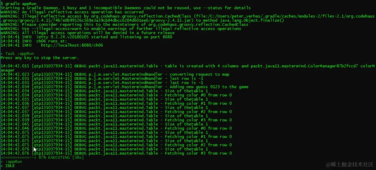 同时,如果您在控制台中输入gradle appRun,您会看到代码正在打印日志消息,如下图所示: