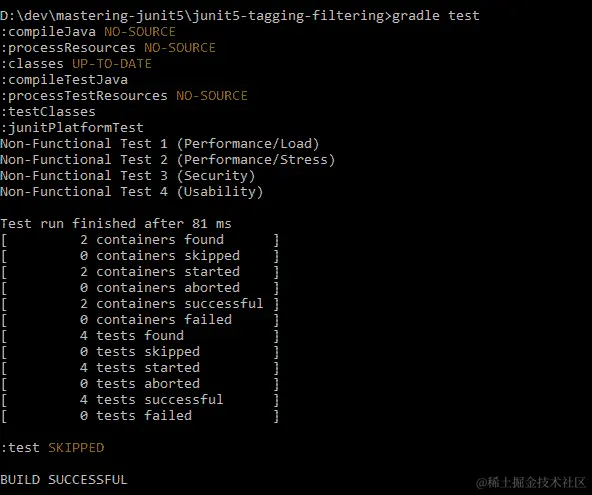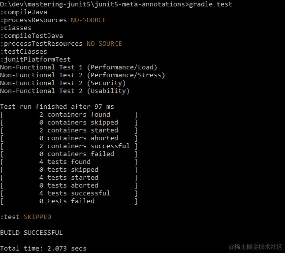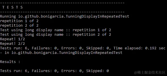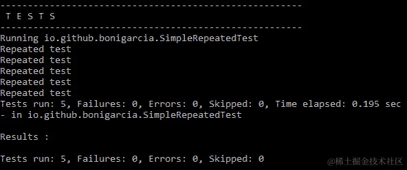 由于这个测试只在标准输出中写了一行(Repeated test),当在控制台中执行这个测试时,我们会看到这个迹象出现五次: