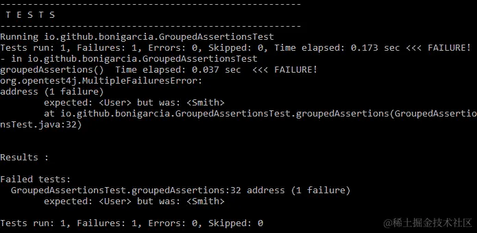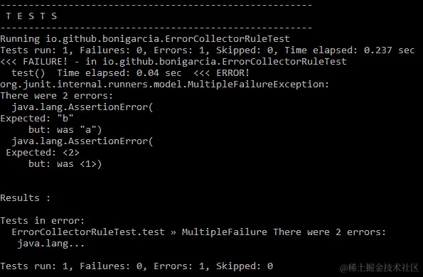以下测试演示了在 Jupiter 测试中使用 ErrorCollector 规则。请注意,收集器规则允许在发现一个或多个问题后继续执行测试: