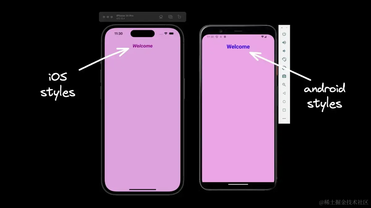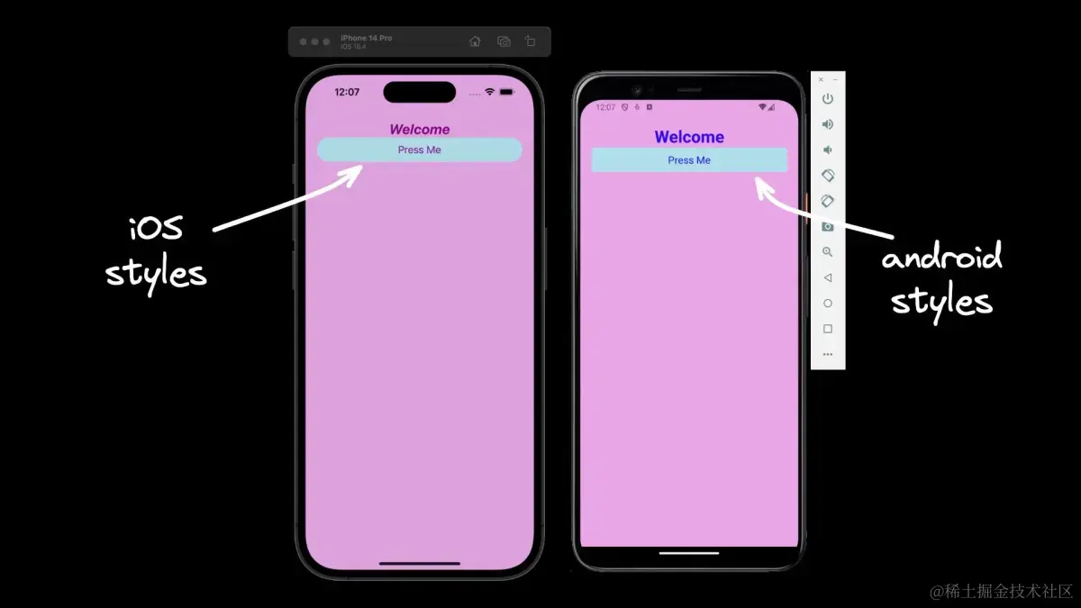 Platform模块可以检测应用正在运行的平台,因此您可以实现平台特定的代码。您可以使用 Platform.OS 进行小的更改,或者使用 Platform.select进行更全面的平台特定样式。以下是一个示例: