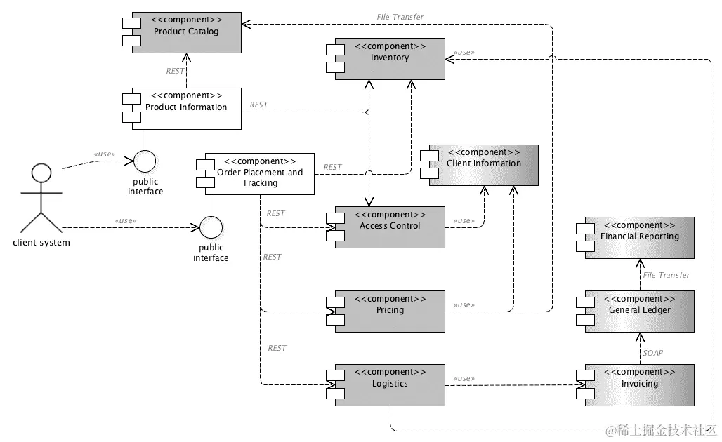 下单跟踪模块还需要访问产品库存和访问控制模块,检查订单是否可以完成。同时,它还需要来自定价模块的服务,该模块可以计算订单的价格,以及来自物流模块的服务,该模块触发从库存位置收集货物并将货物发送给客户。物流也与发票有关联,发票与总账有关联,但这些只是在图片上显示信息的旅行并没有到此为止。有许多其他模块运行公司,所有这些都不是我们目前感兴趣的。