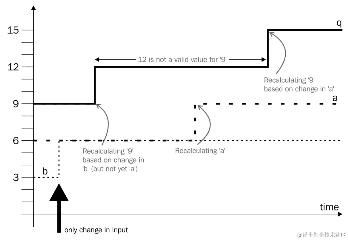 当参数b改变时,例如从3改变为6,则a的值将从6改变为9,从而q将从9改变为15。这很简单。然而,基于对变更的识别的执行命令可以首先将q的值从9改变为12,然后在第二步骤中将其修改为15。如果负责计算q的计算节点将b中的变化识别为b值变化的结果,则会发生这种情况。在短时间内,q的值将是12,这与前一个值不匹配,也与更改的状态不匹配。此值只是系统中的一个小故障,在输入更改后发生,并且在系统中输入没有任何进一步更改的情况下消失: