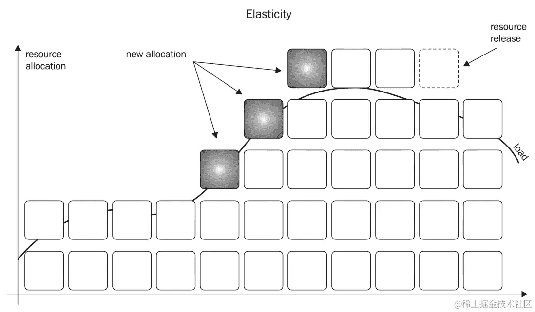 弹性还假设系统是可伸缩的。弹性和可伸缩性这两件事密切相关,但并不相同。可扩展性意味着应用可以适应更高的负载,分配更多的资源。可伸缩性并不关心这种分配是在一个专门用于应用的计算中心中静态购买和驱动巨大的计算机机箱,还是按需从云中动态分配资源。可伸缩性仅仅意味着如果需求翻倍,那么资源也可以成倍地满足需求。如果所需资源中的乘法因子与需求中的乘法因子相同或不大于需求中的乘法因子,则应用是可伸缩的。如果我们需要更多的资源来满足需求,或者如果我们不能满足需求,即使需求只是适度增长,那么应用是不可伸缩的。弹性应用总是可伸缩的;否则,它们就不能是弹性的。