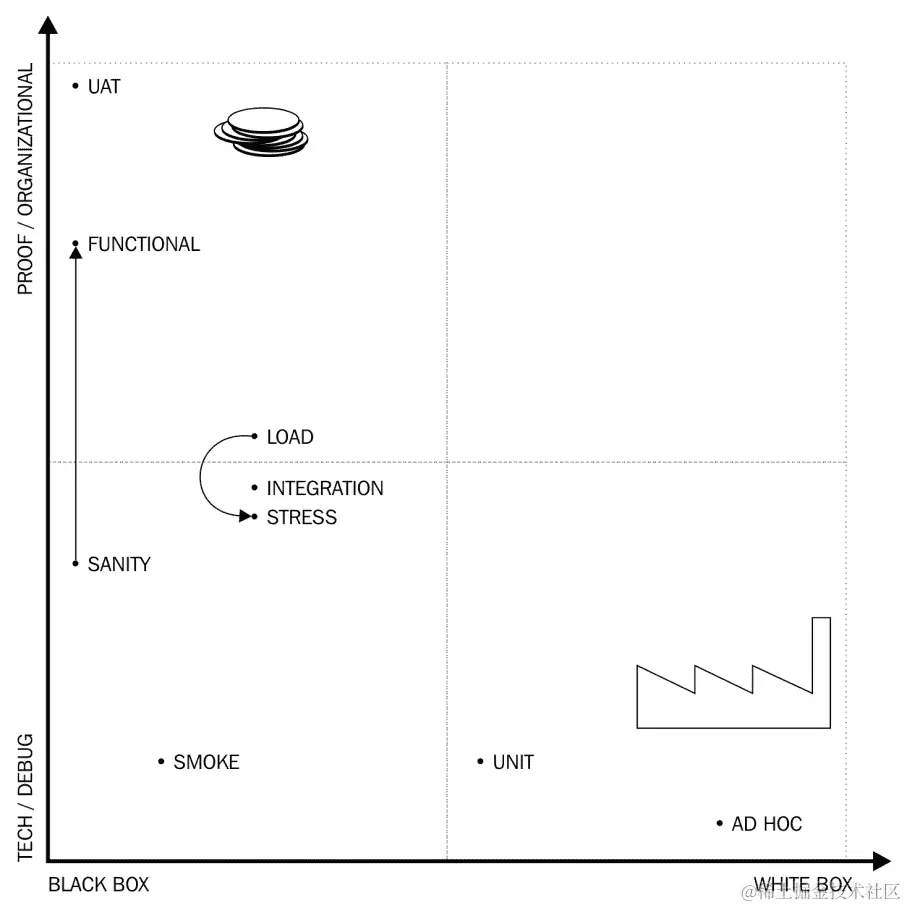 可能发生的情况是,日常执行的频率不足以及时发现集成问题,但是更频繁地执行集成测试仍然是不可行的。在这种情况下,集成测试用例的子集被更频繁地执行,例如,每小时执行一次。这种类型的测试称为烟雾测试。下图显示了不同测试类型的位置: