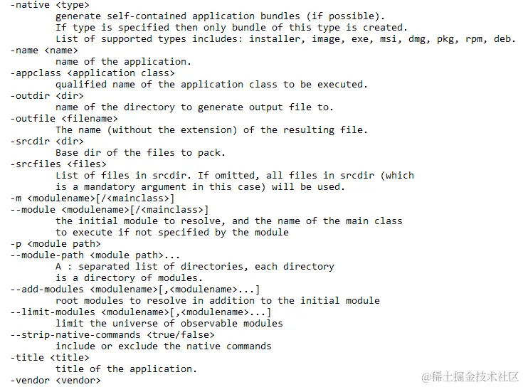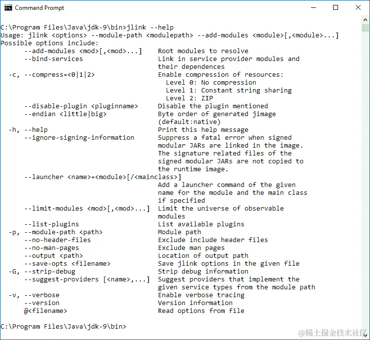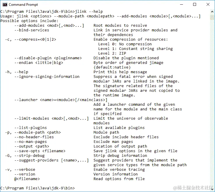 JLink 是一个命令行链接工具,它允许创建包含较小 JDK 模块子集的运行时映像。这将导致更小的运行时映像。以下语法由四个组件组成jlink命令、选项、模块路径和输出路径: