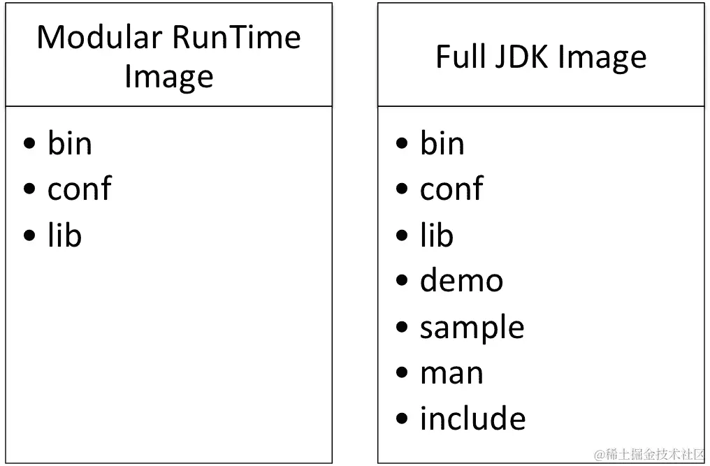 Java9 运行时映像如下图所示。如图所示,完整的 JDK 映像包含与模块化运行时映像相同的目录以及demo、sample、man,并且包括目录: