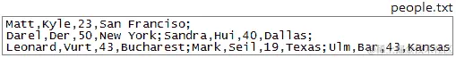 但是,文件可能包含不同类型的混合信息。例如,下图中的文件(people.txt)包含由不同分隔符(逗号和分号)分隔的字符串和整数: