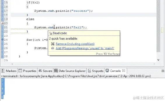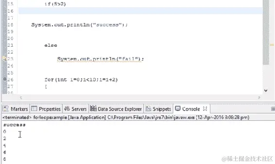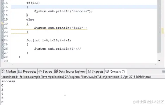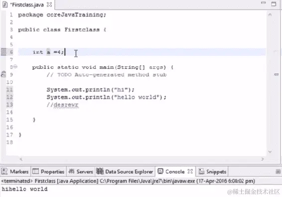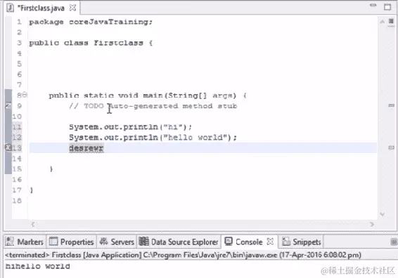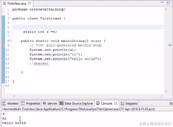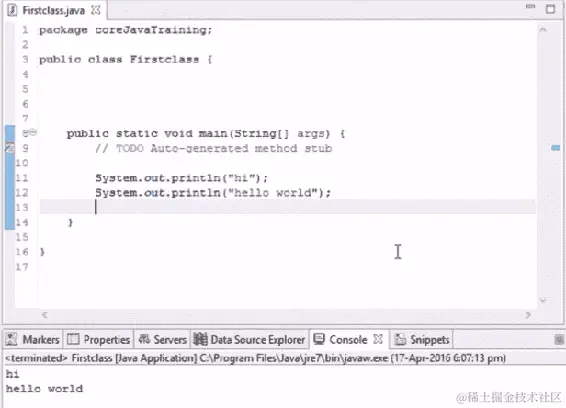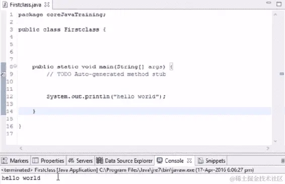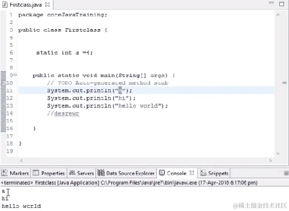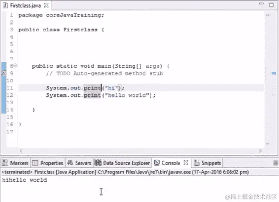 让我们从这一节开始进行基本编码。如果我们想要在输出中打印一些内容,Java 中有一个命令叫做 System.out.println()。这个命令将在控制台中打印输出。假设我们想要打印 hello world,当我们运行以下代码时,hello world 将在我们的输出控制台中打印出来: