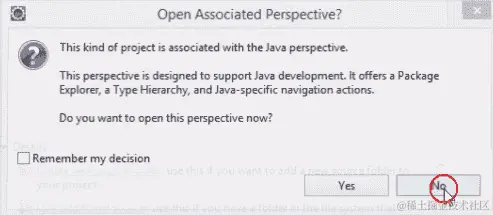我们为我们将要创建的 Java 项目选择一个项目名称。我们将命名我们的第一个项目为coreJavaTraining。点击下一步,然后完成。我们将收到一个提示,询问我们是否要打开关联的透视?选择否: