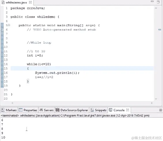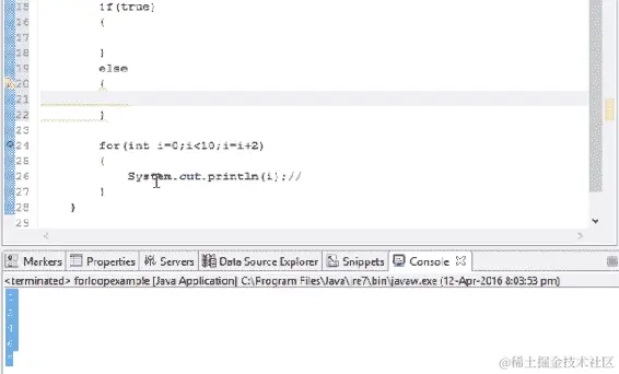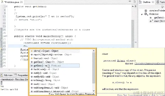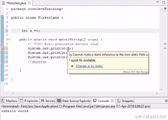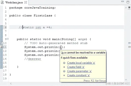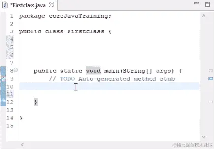 我们可以看到内置的层次结构已经为我们创建好了,因为 Eclipse 创建了一个外部模板。我们可以在编辑器中看到一个类和public static void main已经存在。所有这些都是由 Eclipse 工具创建的。如果我们在记事本上正常写作而不使用任何工具,我们需要创建模板。但是在 Eclipse 中,我们只需要给出类名。我们将要输入的代码将被封装在类中;也就是说,在类的括号内。我们在创建文件时使用的任何名称都将成为类名。