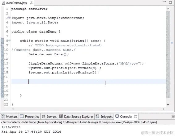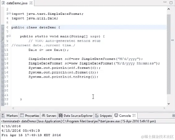 因此,我们实际上可以根据我们的需求格式化我们的日期,并将其传递到SimpleDateFormat方法中。我们可以将d对象带入并放入一个参数中,这样它将以特定的方式格式化。这就是使用 Java 检索日期的方法。