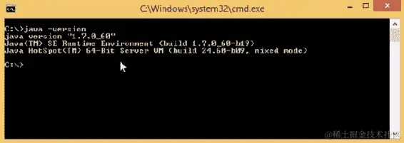 如果我们想要交叉检查环境变量是否正确配置,我们使用命令提示符。在命令提示符中,我们输入 java -version 并按 Enter。如果我们得到如下屏幕截图所示的输出,这意味着 Java 已成功配置在我们的系统上:
