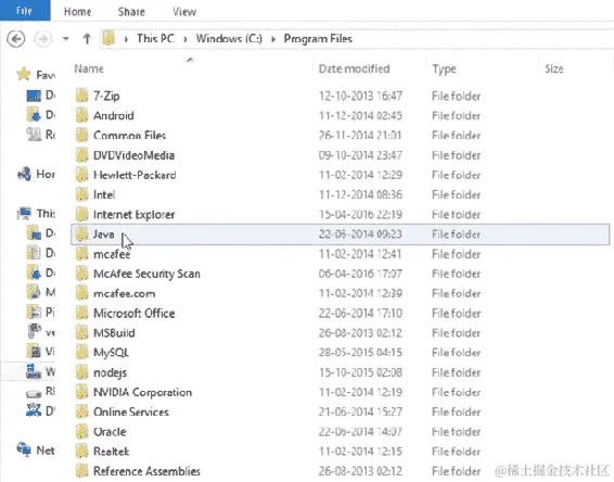 这里需要记住的一个重要点是,如果我们是 64 位的,那么我们只会在Program Files中看到这个Java文件夹。如果我们的机器是 32 位的,那么我们需要回到Program Files (x86)去获取Java文件夹。