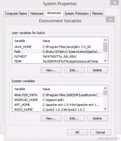 当我们在 Rahul 部分的用户变量中点击“新建”,我们将收到一个提示添加新的用户变量。我们将名称设置为 JAVA_HOME,将 JDK 路径粘贴到变量值文本框中,然后点击“确定”,如下屏幕截图所示: