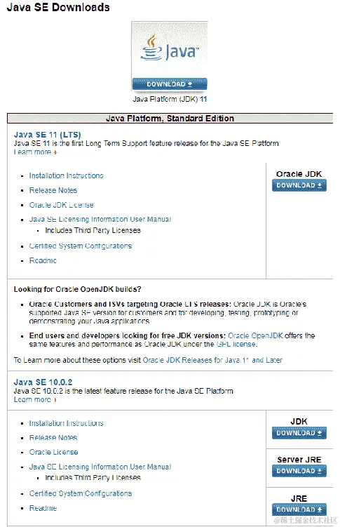 但我们打算在我们的程序中使用 JDK,所以导航到以下网站:www.oracle.com/technetwork/java/javase/downloads/index.html。在这里,有多个版本的 JDK。目前市场上最新的版本是 Java SE 10.0.2。点击下载,如下面的截图所示,以便所有组件都被下载并配置在我们的机器上: