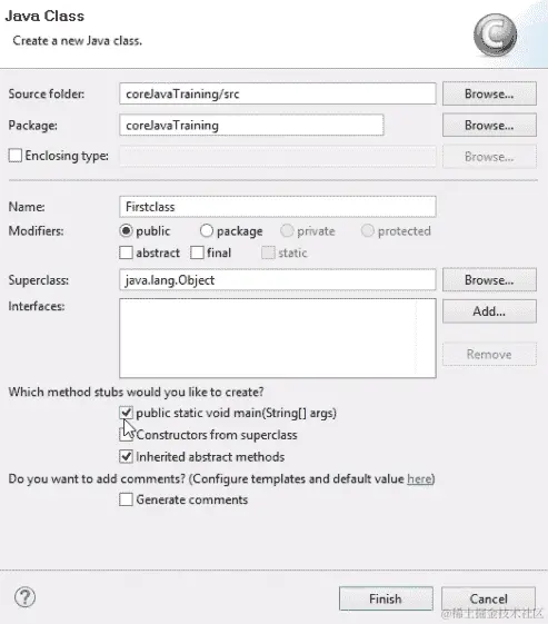 这将成功创建coreJavaTraining。在项目中,会自动创建一个源文件夹。这意味着我们需要在这个源文件夹中编写我们的类。什么是类?基本上,所有的 Java 代码都是写在一个类中的。当我们在记事本中写 Java 时,我们打开记事本,写入 Java 代码,并将特定的记事本文件保存为.java扩展名。但是在 Eclipse 中,所有这些工作都是由这个工具自己完成的。因此,我们只需要创建一个类,这将给我们一个合适的模板。我们右键单击源(src)文件,然后点击新建|类。我们将得到一个 Java 类提示,我们将在其中输入类名。我们将命名这个类为Firstclass,并确保我们选择了public static void main (String[] args)的复选框;我们将在后面讨论这个的重要性。最后,我们点击完成。这在下面的屏幕截图中显示: