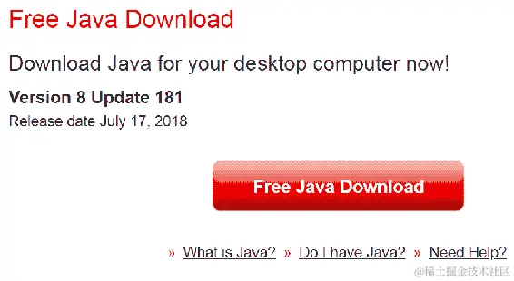 现在让我们回去从互联网上下载 Java 并尝试在我们的机器上配置它。要下载 Java,导航到以下页面:java.com/en/download/。当你点击免费 Java 下载按钮时,如下面的截图所示,JRE 版本将被下载: