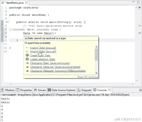前面的代码语法表明我们不知道Date类在哪里。为了使这个类在我们的 Java 文件中可用,我们需要导入util Java 包,因为这个Date类被打包到那个特定的包中。如果我们在前面的类中使用它来导入这个包,你就可以成功地使用那个日期。将鼠标移到这里,它会显示import 'Date' (java.util),如下面的截图所示: