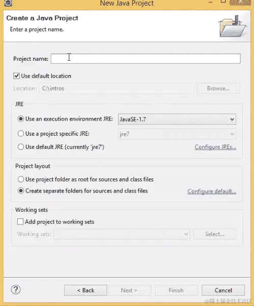 正如我们所看到的,有许多不同的框架可用,比如 Java 项目、C/C++和 Android,但我们只对 Java 项目感兴趣,所以我们选择 Java 项目,然后点击下一步。我们将得到一个新的 Java 项目窗口,在这里我们将填写我们新项目的所有信息,如下面的屏幕截图所示: