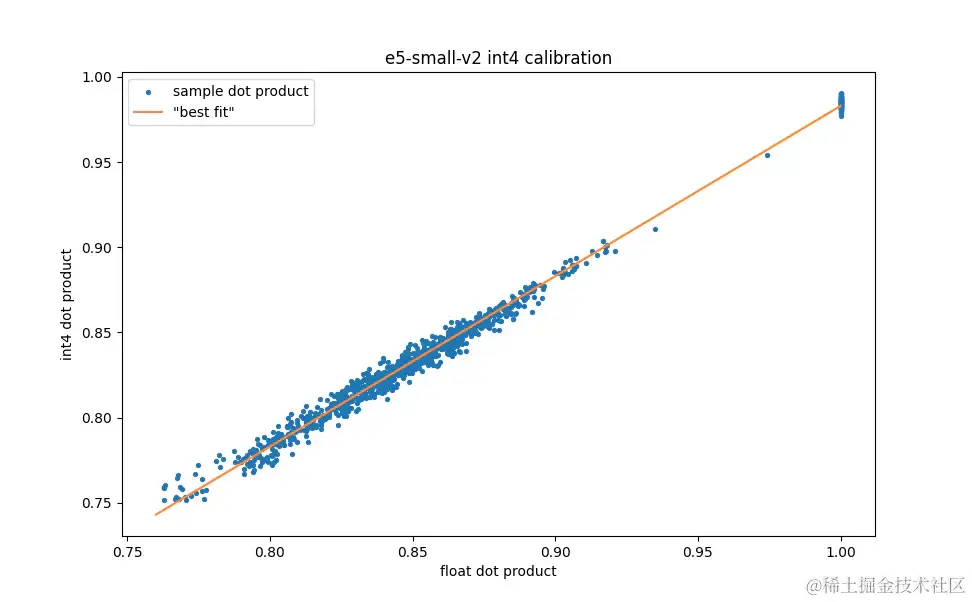 对 100 个文档及其 10 个最近邻居的随机样本的 int4 点积值与相应的浮点值的比较。