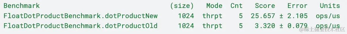 微基准测试(micro-benchmark)比较了使用新的 Panama API(dotProductNew)和标量实现(dotProductOld)的点积操作。