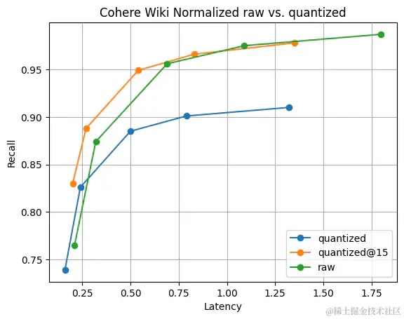 量化向量与原始向量的 Recall@10。量化向量的搜索性能显著快于原始向量,并且通过获取仅 5 个额外向量即可快速恢复召回率;这在 quantized@15 中可见。
