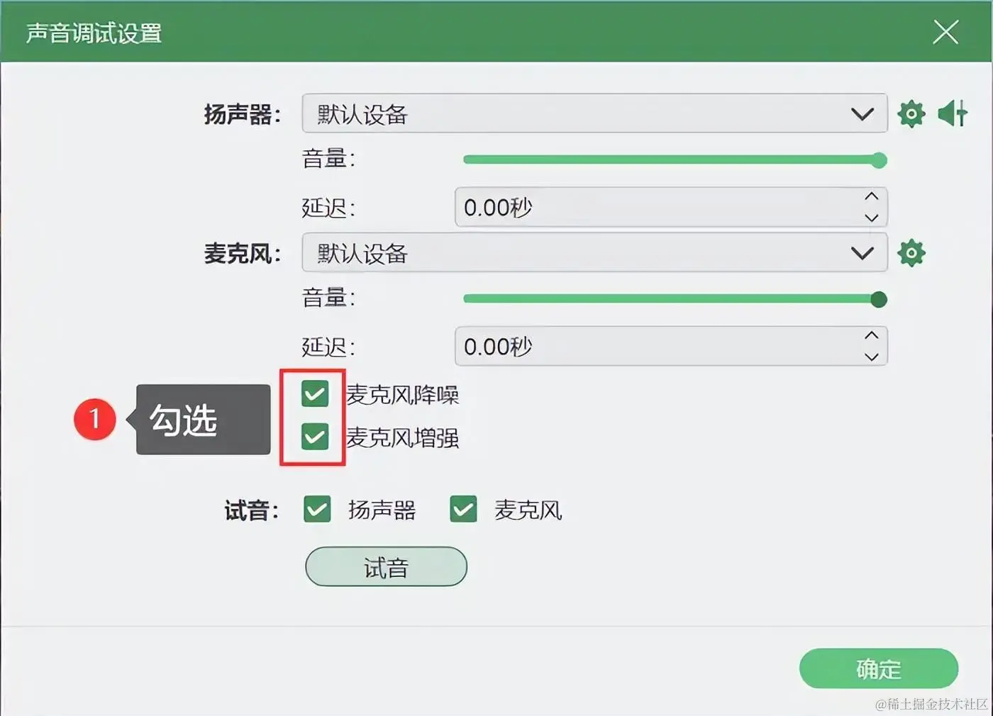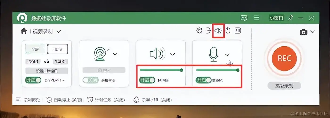 第二步:在视频录制模式中,扬声器代表的是录取内部声音,麦克风领取的是外部声,你可以自由选择打开或者关闭。同时还可以点击右上角的音量符号进行声音高低的调节。为了您录制的视频声音更清晰,您还可以选择勾选麦克风降噪或者麦克风增强来调节。