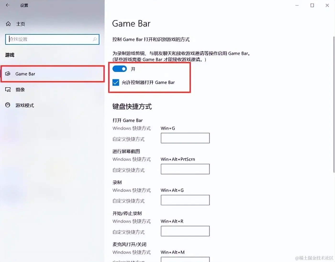 第二步:点击 “Window+i” 打开设置窗口,并点击 “游戏” ,点击打开 “Xbox Game Bar” 。