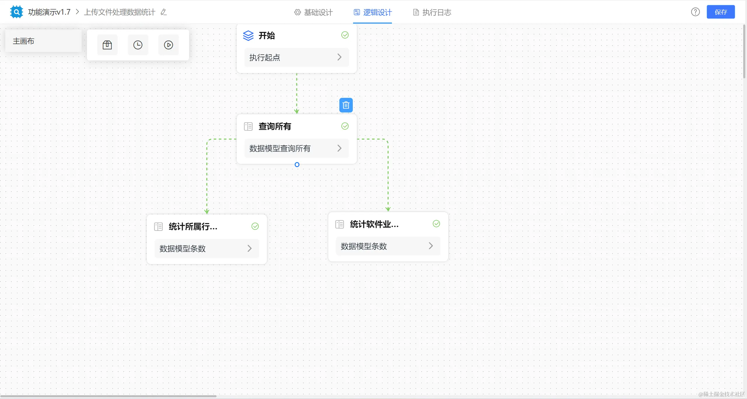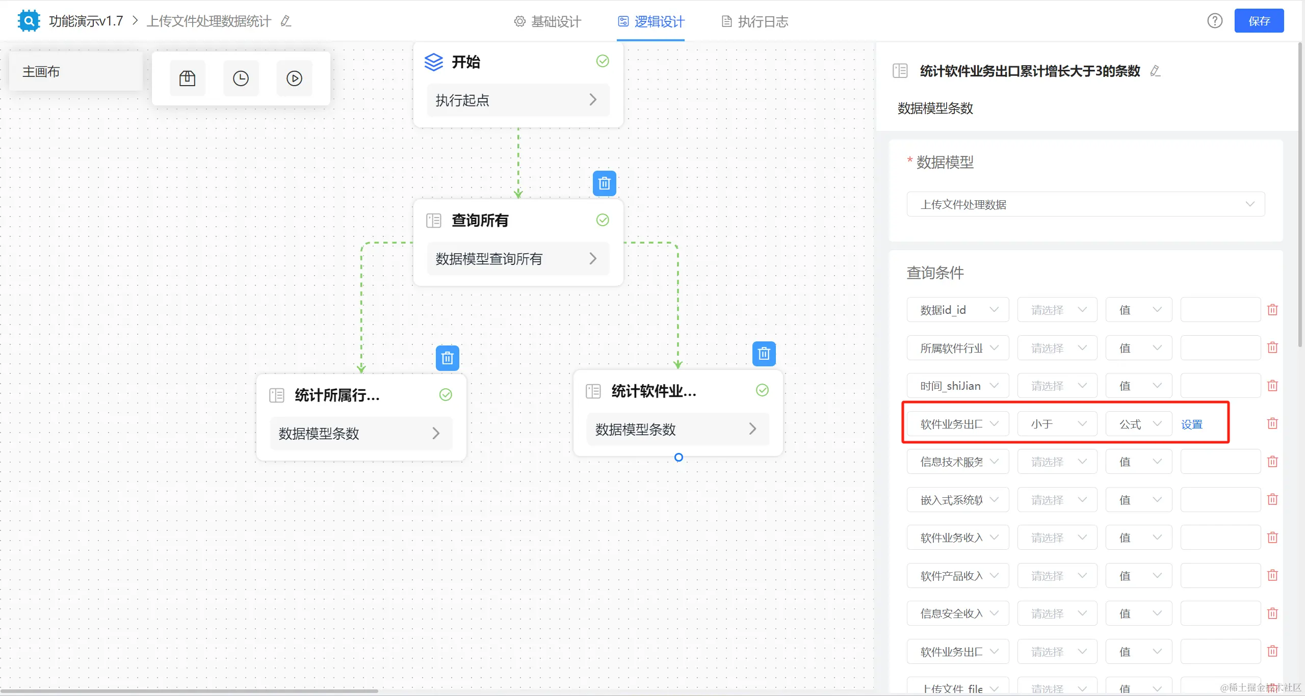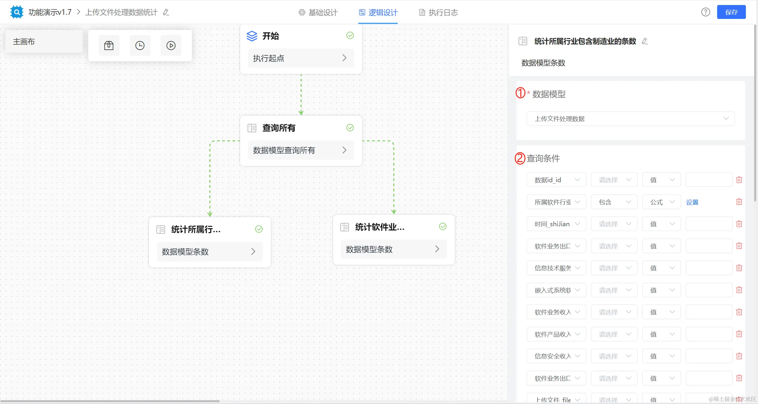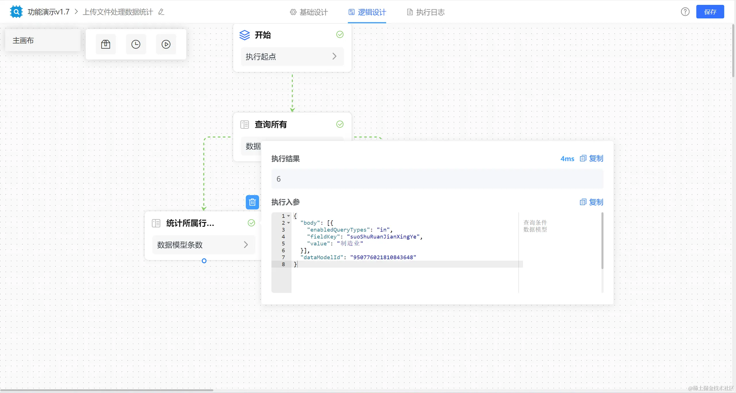 举例:某列表包含有某个字段的数据条数我们想要统计出来并传到下一逻辑节点做判断等操作,那么我们就可以再逻辑引擎中设计【统计条数】节点执行。