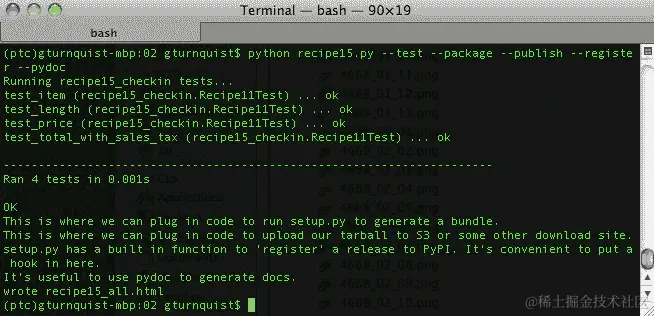 -test -package -publish -register -pydoc运行recipe15.py脚本。在下面的屏幕截图中,您是否注意到它如何按照在命令行上提供的相同顺序来执行每个选项?