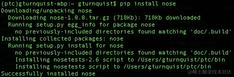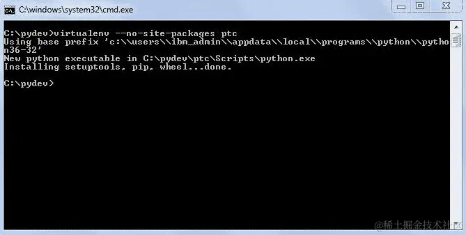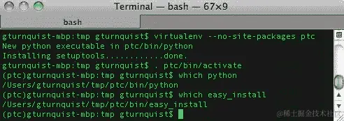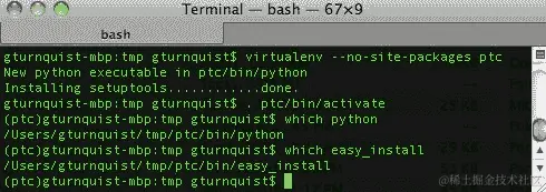 virtualenv后,使用它创建一个名为ptc(Python Testing Cookbook的缩写)的干净环境,使用--no-site-packages。 -