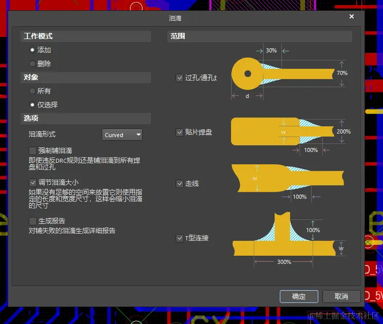 (一般我们为了保证泪滴的添加完整,我们对此项进行勾选,后期DRC我们再修正即可)