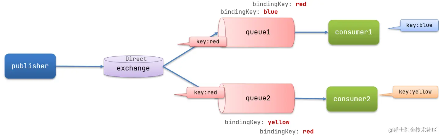 队列与交换机 通过一个路由键(routing key) 绑定, 消息的发送方在 向交换机 exchange 发送消息时,必须指定消息的 routing key, 交换机不再把消息交给每个绑定的队列,而是根据 消息的 routing key 判断,只有队列的 routing key 与消息的 routing key 完全一致,才会接收到消息。